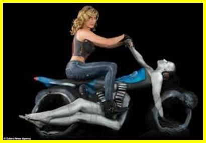 My buddy came up with the most awesome idea for interpreting his idea of the sexual side of a bike. Not the typical half dressed or naked chick straddling a bike. Oh no! His interpretation is beyond that. He created a bike out of naked chicks. Yeah he did and it is hot as fucking hell! I am so glad he let me be a part of it. Can you find me? Look real hard while you get real hard and see!